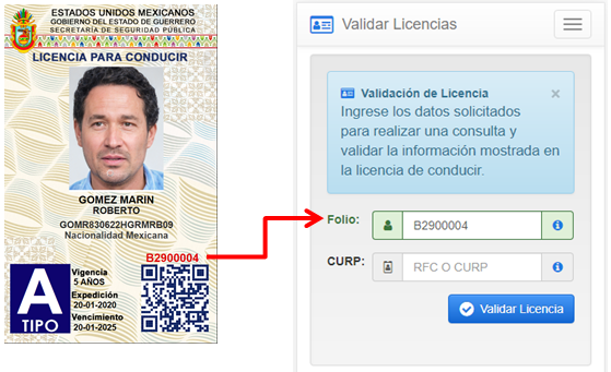 No se encontró coincidencia al consultar el número de FOLIO: y el RFC/CURP: que se ha ingresado para validar la licencia de conducir, es posible que dicha información aún no ha sido compartida por la institución que expidió la licencia, una vez que la información sea integrada a la Base de Datos de Plataforma México estará disponible para su consulta, verificación y validación por este medio. Consulte nuevamente después de 10 dias o solicite una aclaración en la institución donde realizó el trámite de la licencia. |